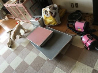 今日もプレイルームでボール投げだぁ〜〜!と、張り切っていたワンズ。トリマーさんが、道具を運び込んで、やっとトリミングだと察したらしく、店長、ブロワーを見た瞬間、咥えていたボールをポロっと落としました。トリマーさん達の事は大好きで、遊ぼうよ!ってつきまとってて、道具を避けるんだなぁ。面白い。